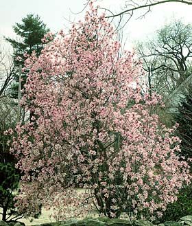 Magnolia 'Leonard Messel' This plant is the result of a chance hybrid between M. kobus and M. stellata Rosea. The purple-pink flowers generally bloom in mid to late April in Boston, followed by the leaves. |